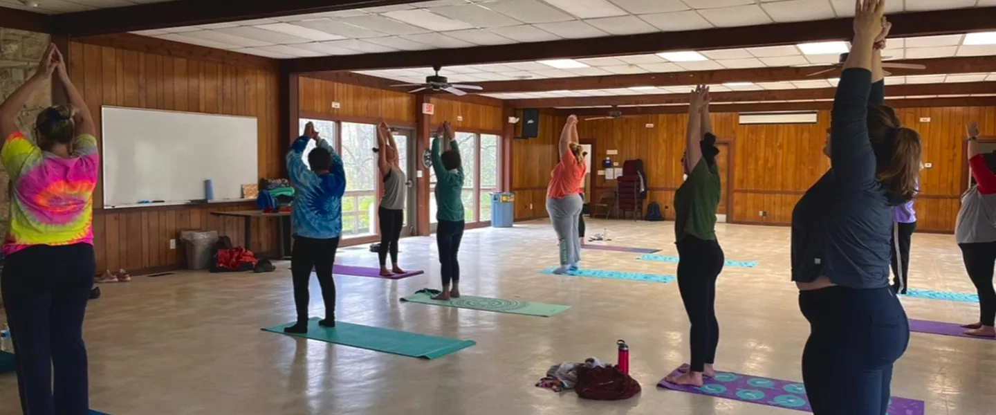 women's weekend campers doing indoor yoga women's weekend campers doing indoor yoga
